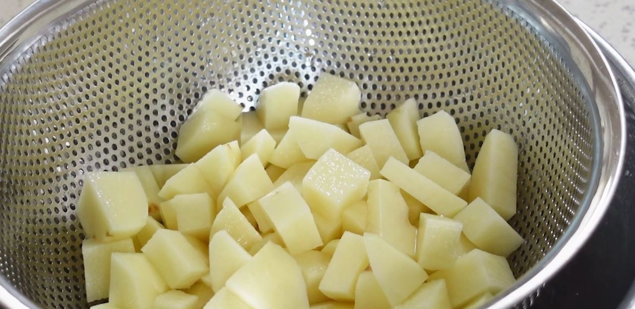 10분이 지나 채반에 담아 물기를 빼고 액상스테비아 4큰술 넣고 살짝 감자들과 섞고