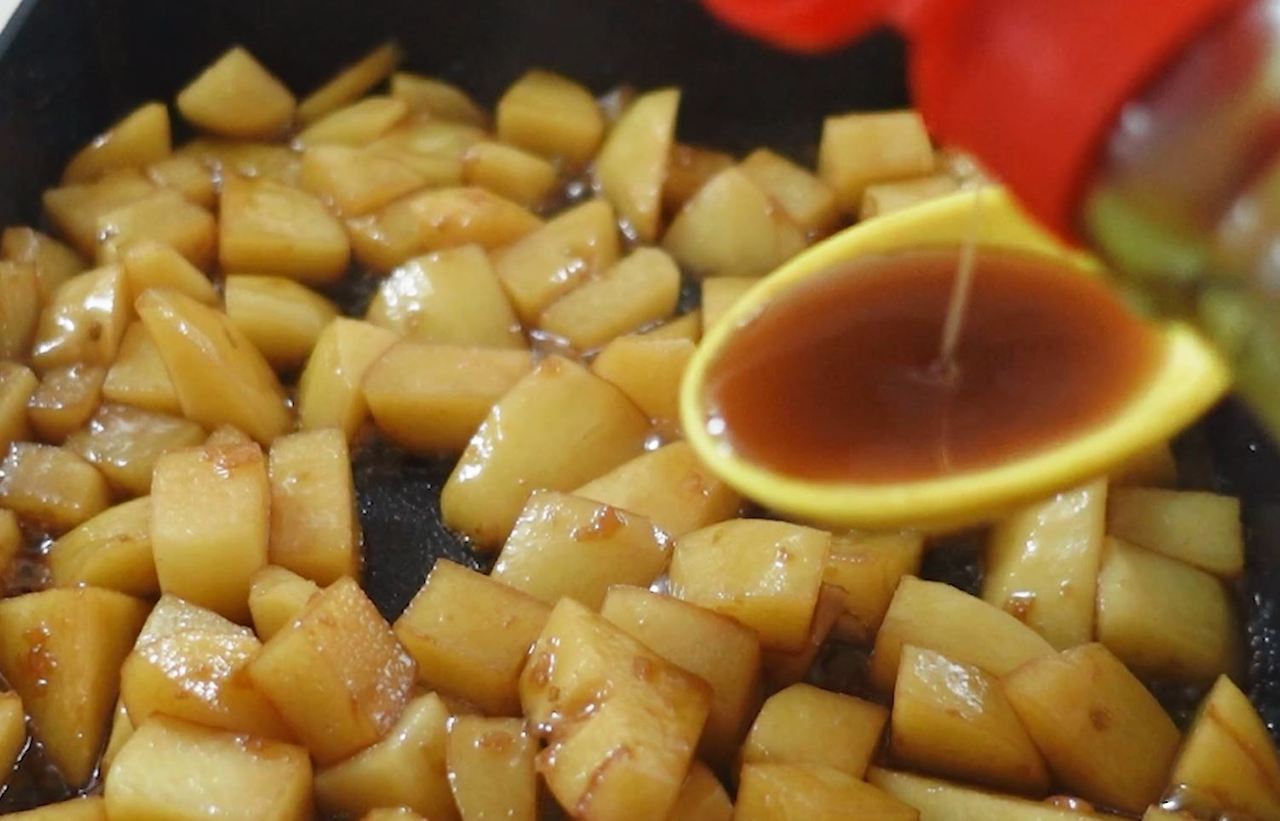 4️⃣ 마늘향이 올라오면 감자(생긴 물까지) 넣고 진간장 3.5큰술 넣어요.