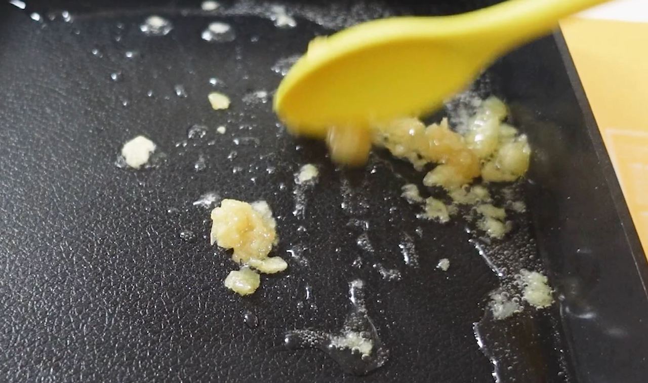 팬에 식용유 3큰술 넣고 중약불에 다진 마늘 0.5큰술 넣고 볶아요.