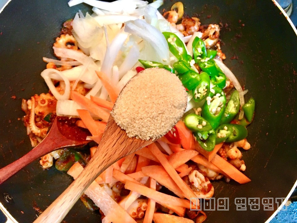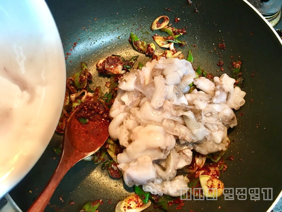▲ 이제 곧바로 쭈꾸미를 넣어주세요. 고춧가루 볶자마자 바로 넣는 것이 중요합니다.