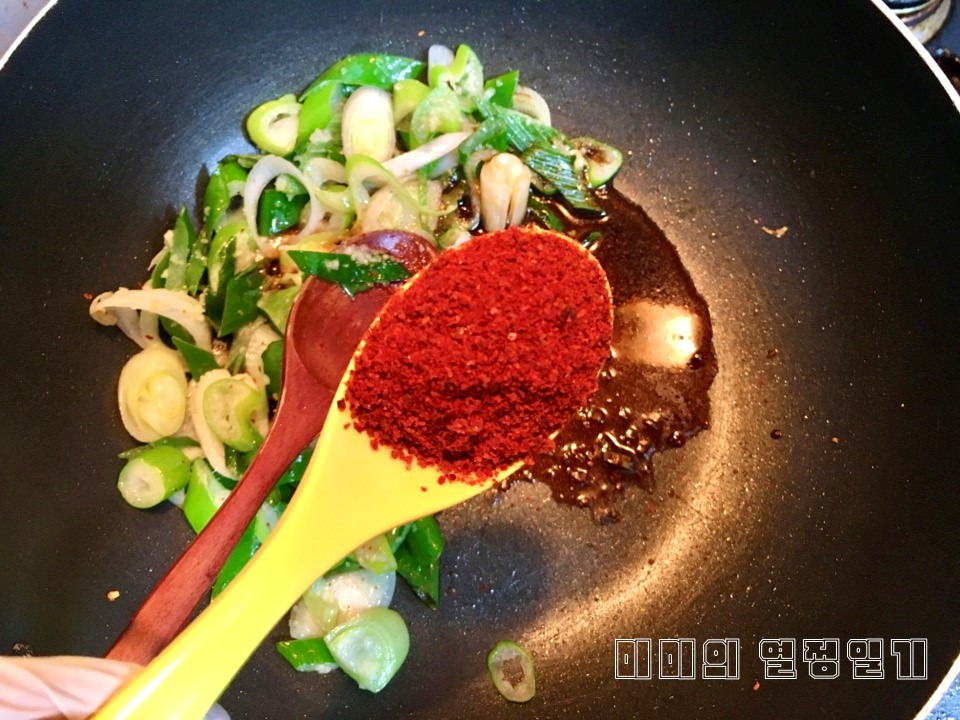 주의! - 이제 간장과 고춧가루를 넣을 것인데요.