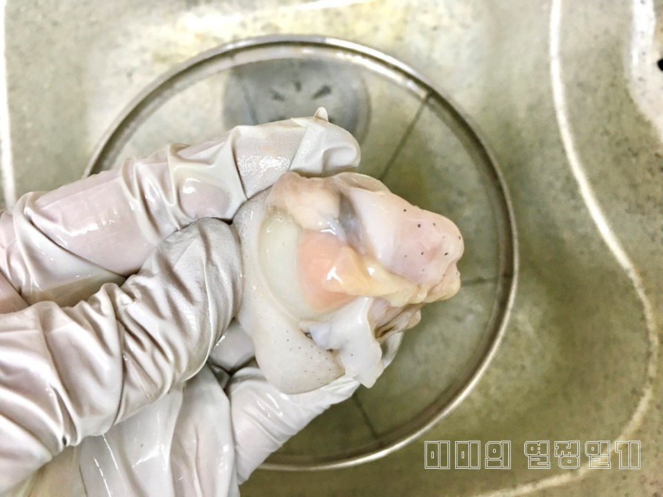 ▲ 다리 안 쪽으로 뒤집으면 입이 보입니다. 이 부분은 제거하시길 권장합니다. 딱딱하고, 식감도 좋지 않습니다.