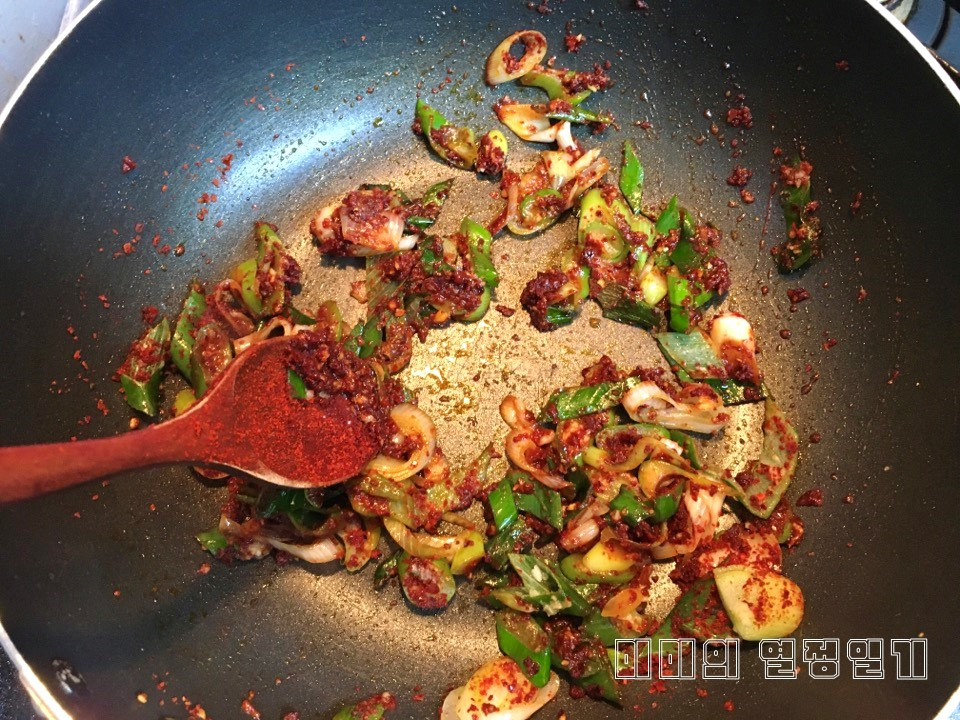 ▲ 이어서 고춧가루를 넣고 한번 뒤집어 주세요.