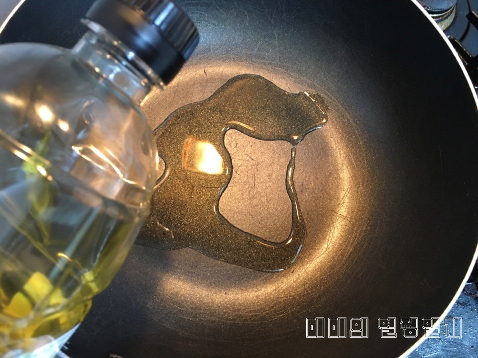 물론 제대로 불 맛을 확실하게 내려면 웍질을 해야 합니다만, 이렇게 파기름 고추기름을 팬에 태우듯 볶아주면 살짝이나마 불 맛이 나요.
