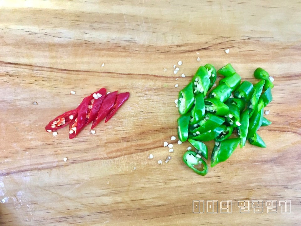 ▲ 청양고추 2개 준비해 주시고요, 홍고추가 있다면 1개만 추가로 준비하세요.