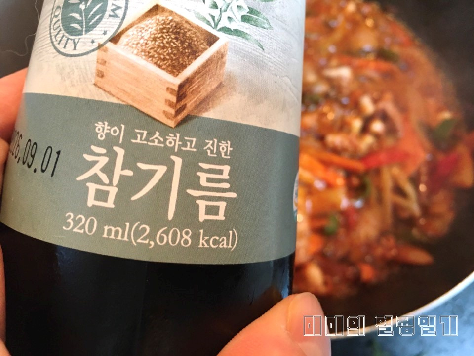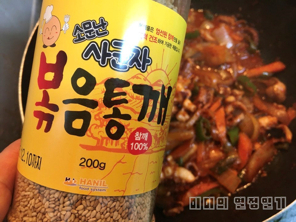 ▲ 불을 끈 후, 참기름 1큰술 살짝 넣고 뒤집기 해줍니다. 마지막으로 통깨도 적당히 뿌려주세요.