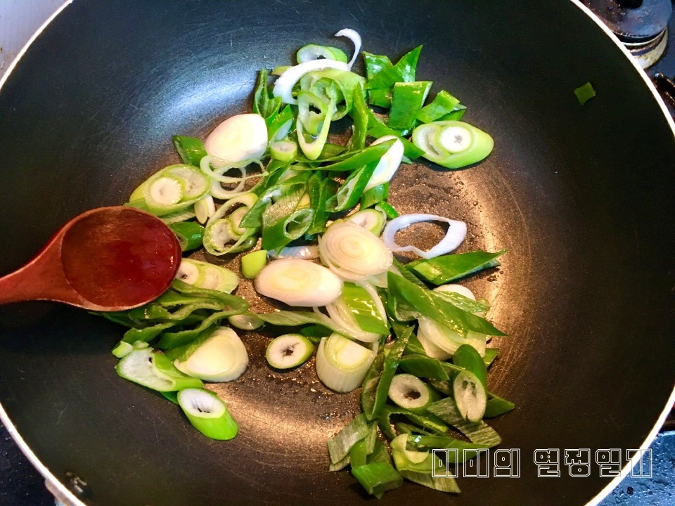 ▲ 식용유 1바퀴 두르고, 대파를 넣어 살짝 볶아주세요.