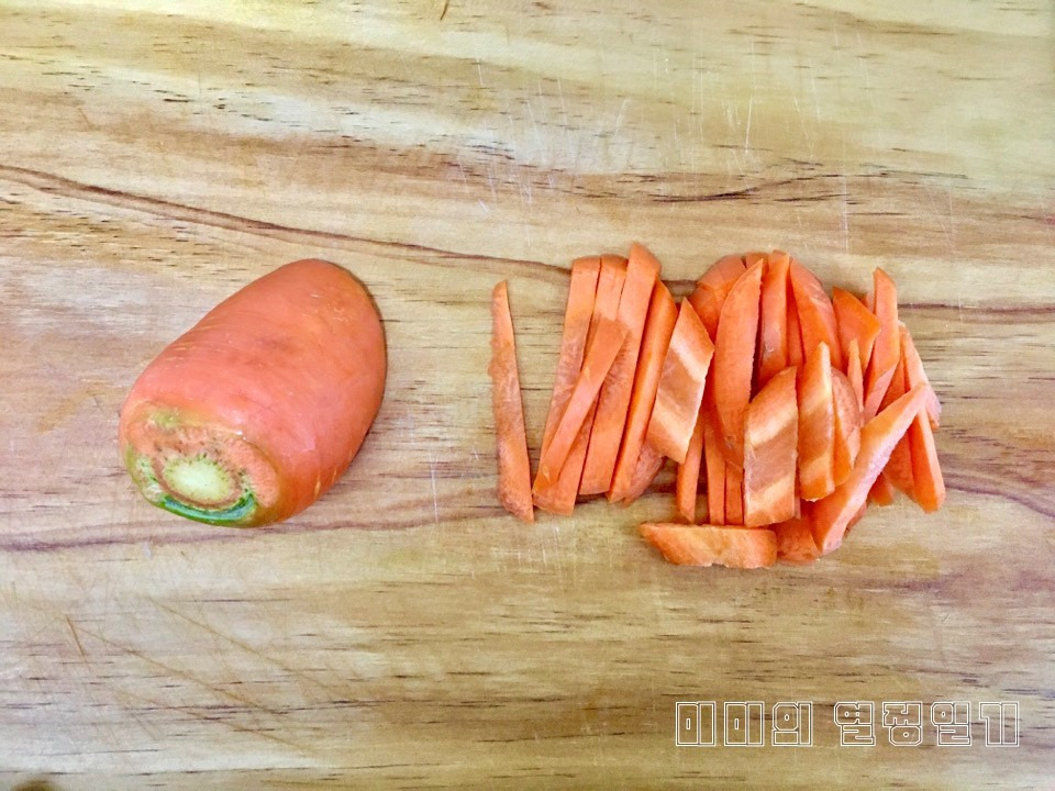 당근은 선택사항인데, 냉장고에 있다면 소량 넣으시길 권장합니다. 볶음 요리에 당근이 들어가면 특유의 단 맛과 향이 잘 어우러집니다.