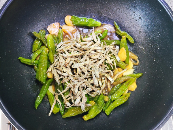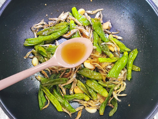 5. 간장 멸치 꽈리고추볶음 양념장 넣고 끓이기