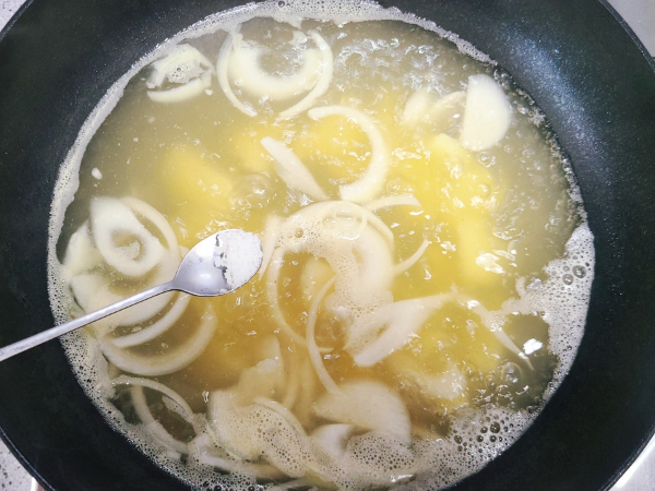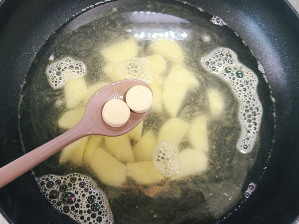 들기름에 감자를 볶다가 물과 동전 육수를