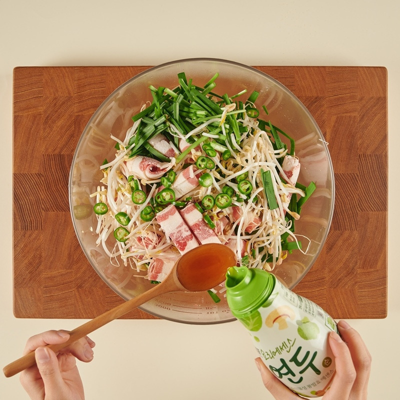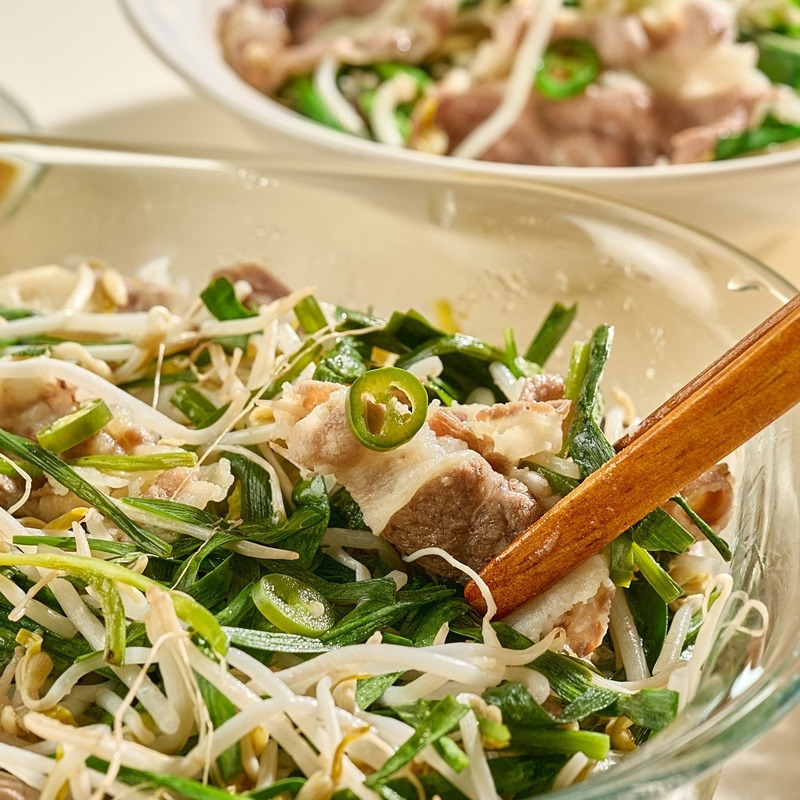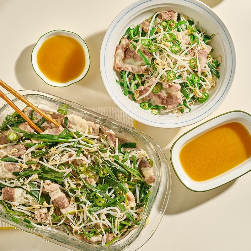 우삼겹 1/3근 (200g), 숙주 1봉 (200g), 부추 2줌 (100g), 청양고추 1개 (10g), 요리에센스 연두순 2스푼 (20g)