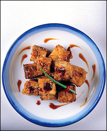3. 밑간한 두부는 키친타월에 올려 물기를 없앤 후 녹말가루를 뿌려 170℃의 튀김기름에 노릇하게 튀겨낸다.