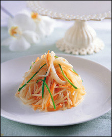 4. 한치 몸통은 껍질을 벗기고 곱게 채썬 후 끓는 물에 살짝 데쳐 참기름, 소금, 후춧가루, 청주에 버무린다.