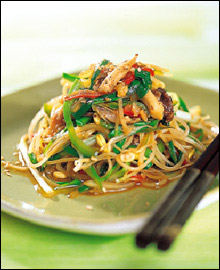 콩나물 200g, 느타리버섯 100g, 양파 1개, 대파 1대, 중국부추 100g, 청·홍피망 ½개씩, 당면 80g, 식용유 3큰술, 간장 2큰술, 다진 마늘 2작은술, 참기름 2큰술, 소금·후춧가루 약간씩