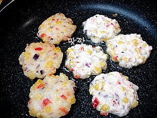 다진파프리카를 넣어 섞어 준 뒤에 팬에 기름을 두루고, 앞뒤로 노릇하게 지져줍니다.
