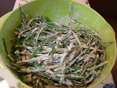 하듯이 부추에 우리밀과 소금을 넣고 버무려서 찜통에 찌는