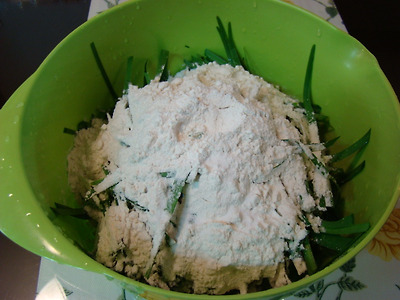 3. 부추를 털어 가면서 골고루 밀가루를 잘 버무려 줍니다.