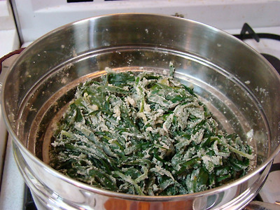 4. 김이 오른 찜통에 부추를 넣고 밀가루가 익을 정도로 쪄 줍니다.