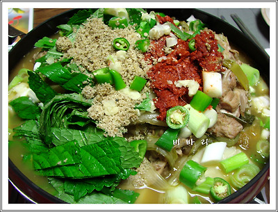 6,다되었으면 뚝배기전골냄비에 담고 약간의 다대기, 깻잎, 들깨가루 얹어서 일회용 렌지위에 올려, 덥히면서 각접시에 덜어 드시게 합니다.