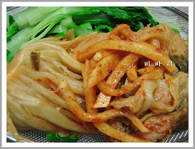 신김치는 소를 털어 내고 물에 설렁설렁 대충 한 번만 헹궈서 양념을 털어 내고 씻어 준비했다가
