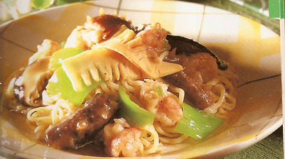 *재료-면, 닭가슴살, 중화, 불린해삼, 표고버섯, 죽순, 피망,