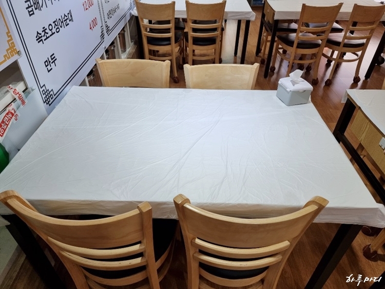 테이블 하나하나 전부 일회용 덮개가 덮어있어