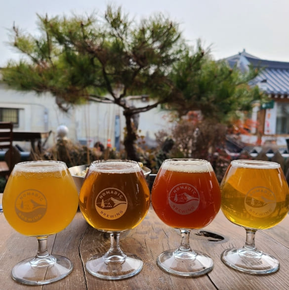 야경을 보고 나면 저절로 맥주가 생각나는데요. 노매딕 비어가든은 전주 한옥마을 수제맥주 전문점으로, 한국적인 분위기의 펍에서 미국 시카고와 독일 뮌헨의 맥주를 마셔보는 이색 체험을 할 수 있습니다.