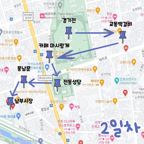 경기전 - 교동떡갈비 - 전주 한옥마을 카페 마시랑게 - 전동성당 - 풍남문 - 남부시장