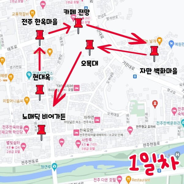 전주역 - 현대옥 전주한옥마을점 - 전주 한옥마을 - 전주한옥마을카페 전망 - 오목대 - 자만벽화마을 - 노매딕 비어가든