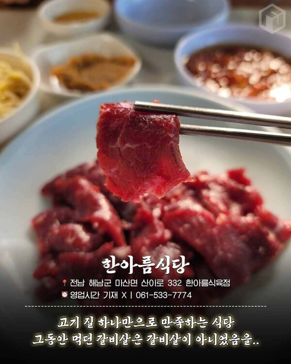단 고기 질 하나만으로 모든 손님을 만족시키는 해남 맛집 '한아름식당'을 소개해보려 합니다. '한아름식당'의 생고기는 아주 쫀득해 신선함을 양껏 자랑하는데요. 함께 판매하는 갈비살은 고소해서 밥이랑 같이 먹어야 갈비살의 제대로의 맛을 느낄 수 있습니다.