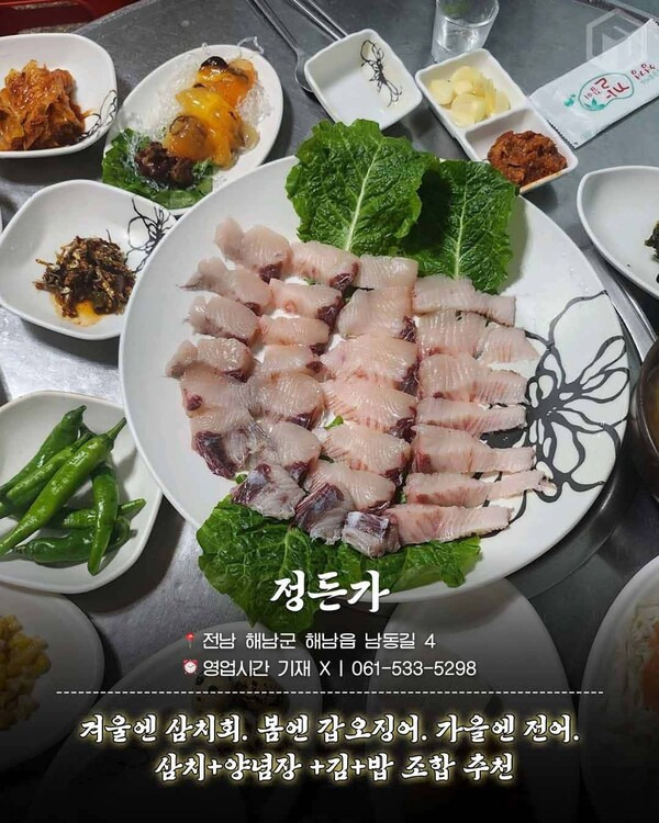 넉넉한 전라도의 인심을 느낄 수 있는 해남 맛집이며 메인요리보다 맛있는 밑반찬으로 평소보다는 과식할 것을 예상하고 방문하는 것이 좋습니다. 겨울에 방문하신다면 꼭 삼치회를 먹어보셔야 하는데요. 특히 삼치와 양념장, 김과 밥을 함께 쌈으로 싸 한번에 드시는 것을 추천드립니다.