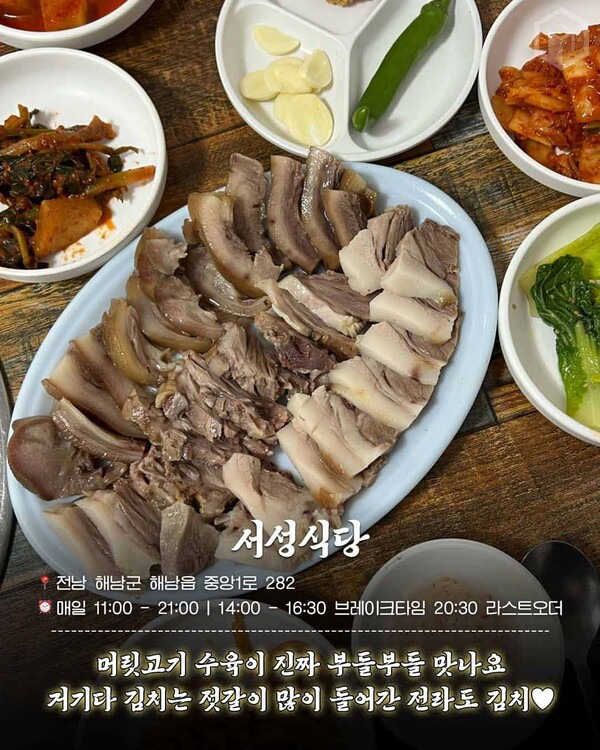 두번째로 소개해드리고 싶은 해남 레전드 찐맛집은 '서성식당'입니다. TV 프로그램인 '허영만의 백반기행'에도 출연한 맛집이라 알만한 사람들은 아는 해남 맛집인데요. 이곳에서는 꼭 머릿고기 수육을 맛보셔야 합니다.