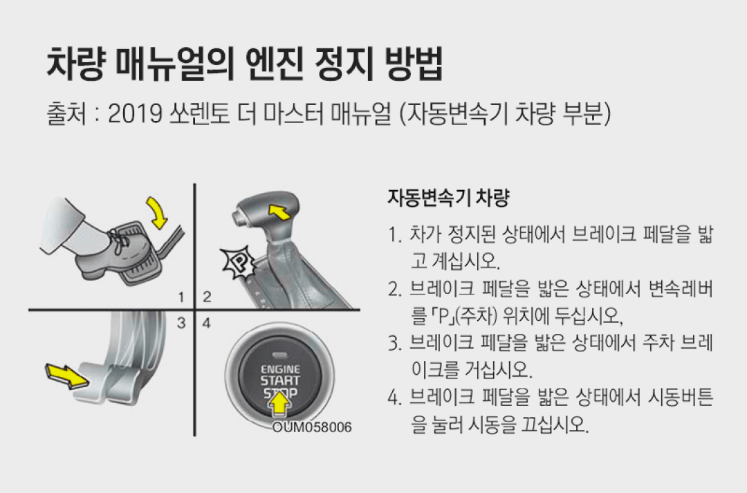 앞서 살펴본 매뉴얼의 주차브레이크 사용법과 달리 엔진 정지 방법에 '브레이크 페달을 밟은 상태에서 P기어를 넣고 주차브레이크를 걸라'라고 나와 있어요!