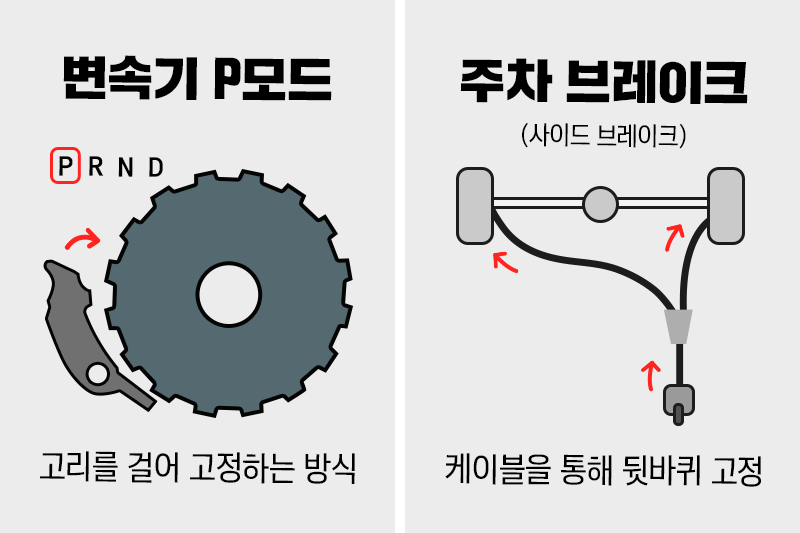 그래서 P기어에 부담을 줄이고 주차브레이크가 더 많은 하중을 받을 수 있도록 주차브레이크 체결 후 P기어를 넣는 것이 가장 확실한 방법입니다.