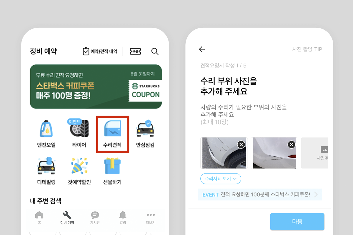 사용방법은 간단합니다. 앱을 통해서 간단히 훼손 부위의 사진을 올리기만 하면 무료로 내 주변 업체의 여러 견적서를 받아보실 수 있는데요.