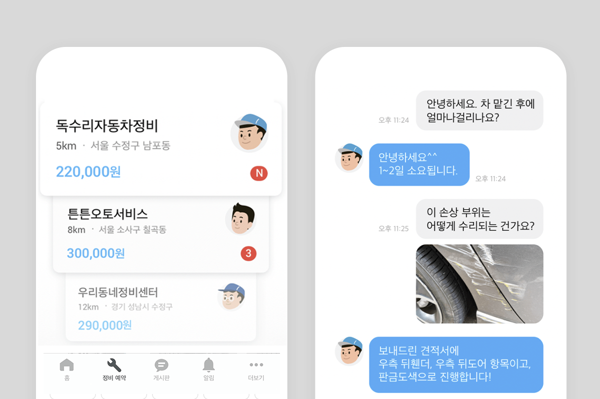 업체 선택 후 자세한 수리내용은 채팅으로 실시간으로 물어볼 수도 있으니 막막한 상태에서 이것저것 알아보는 것보다 훨씬 더 효율적으로 합리적인 수리비용을 알아보실 수 있습니다.