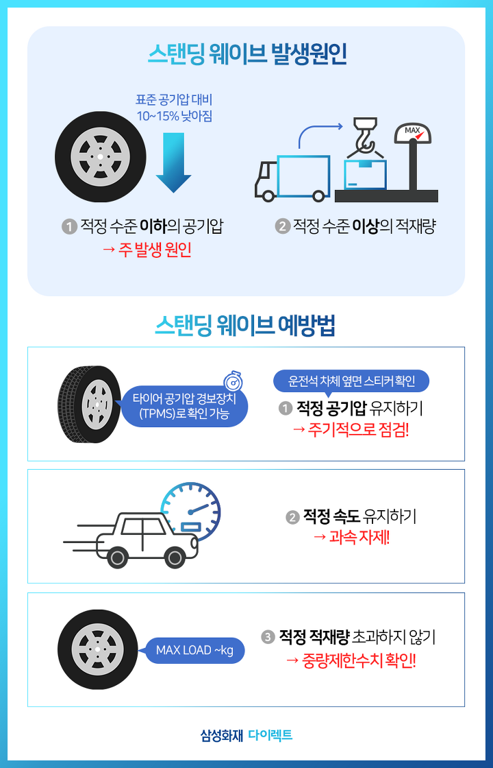 스탠딩 웨이브 발생원인은 크게 두 가지입니다. 적정 수준 이상의 차량 무게와 적정 수준 이하의 공기압입니다. 하지만 대부분의 원인인 타이어의 낮은 공기압인데, 표준 공기압 대비 10~15%의 기압이 부족할 때 발생합니다.