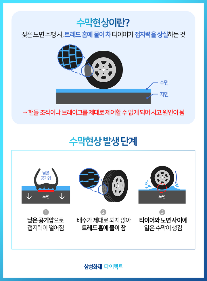 스탠딩 웨이브 현상 외에도 타이어 공기압이 낮으면 발생할 수 있는 위험한 현상이 또 하나 있습니다. 바로 ‘수막현상’입니다. 낮은 공기압 때문에 접지력이 떨어지면, 노면 위의 물을 잘 밀어내지 못해 타이어 배수가 제대로 되지 않는데요. 이렇게 트레드 홈에 물이 차면 타이어와 노면 사이에 얇은 수막이 생깁니다. 이때, 타이어는 마치 물 위에 떠 있는 듯한 상태가 되는데 핸들이나 브레이크를 제대로 제어할 수 없게 되어 큰 사고로 이어질 수 있습니다.