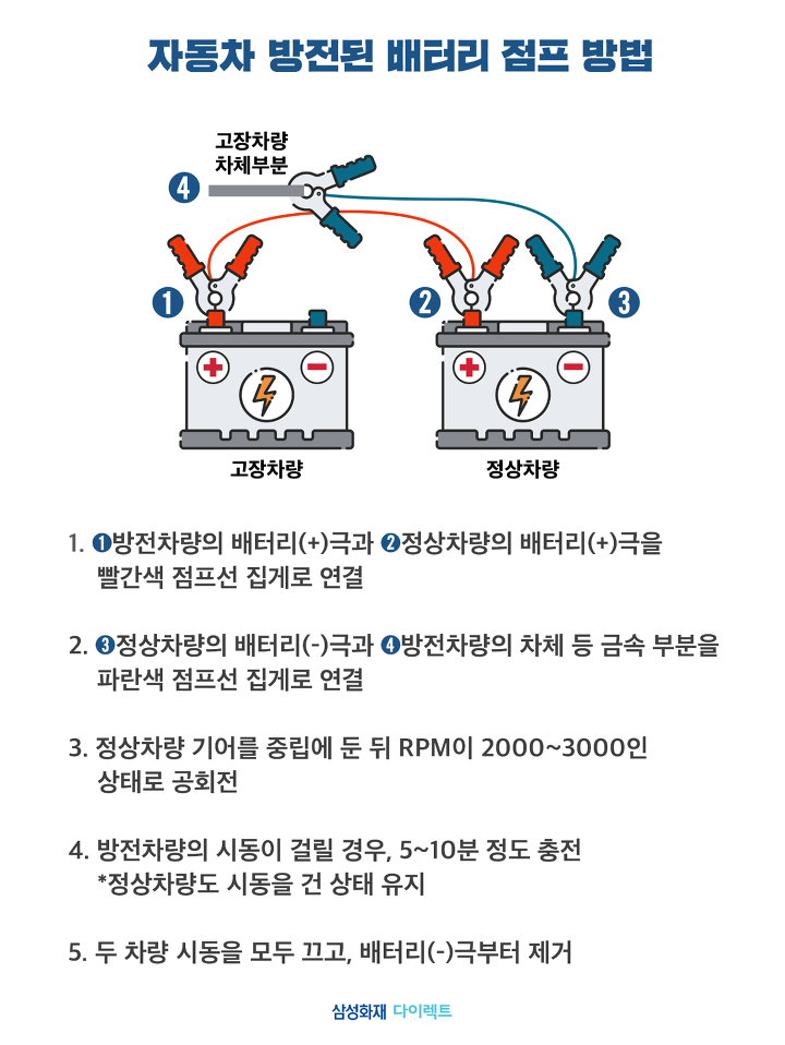 이 방법은 방전이 되었을 때 임시방편으로 할 수 있는 대처법이므로 시동이 걸렸다면 정비소 등을 찾아가 배터리 상태를 정확하게 점검하는 것이 좋습니다.
