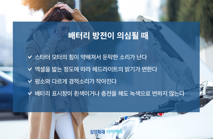 배터리가 완전히 방전되면 시동 자체가 걸리지 않지만, 그전에 이상 징후가 나타난다면 배터리 교체나 충전 등의 방법으로 방전되는 것을 막을 수 있습니다.