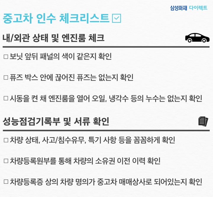 새로 구매한 차량을 인수하러 가기 직전까지 반드시 자동차보험을 가입해야 합니다. 신차는 아직 차량 번호가 안 나왔기 때문에 우선 차대번호 17자리를 확인하여 가입하면 되고 중고차는 해당 차량의 번호 그대로 가입하시면 됩니다. 차량 인수 당일에는 이것저것 신경 쓸 것들이 많기 때문에 여유 있게 2~3일 전에 미리 가입해두시는 것이 좋습니다. 혹시, 차량 인수일이 주말인데 보험 가입을 깜빡 잊고 계셨다고 해도 걱정할 필요는 없습니다. 삼성화재 다이렉트 자동차보험은 365일 24시간 언제 어디서나 PC와 모바일로 즉시 가입할 수 있어 편리하기 때문입니다. 위의 내용을 모두 읽으셨다면, 이제 차량을 인수하러 가실 준비가 끝났습니다. 혹시 모르니 해당 페이지를 즐겨찾기 해두시고 차량 인수하러 가시기 직전 다시 한번 확인하시면 좋을 것 같습니다.