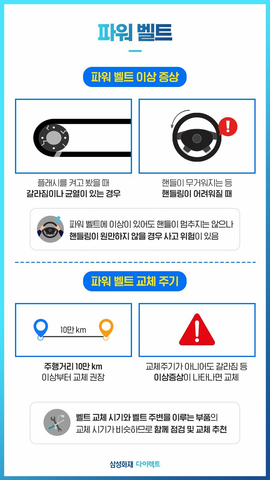 파워 벨트 역시 10만 km 이상 운행 시 교체하는 것을 권고하고 있으나 이상 증상이 없을 경우 꼭 해당 주기를 따를 필요는 없으며, 교체 시 주변부를 이루는 부품 역시 교체 시기가 비슷하므로 함께 점검을 받아 다 같이 교체하는 것을 권장 드립니다.