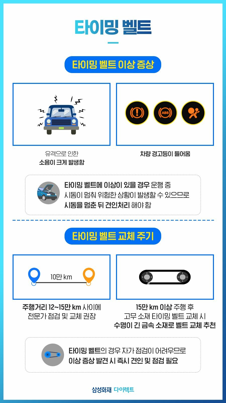 타이밍 벨트는 구동 벨트에 해당하는 팬 벨트&파워 벨트와 달리 자가 점검이 어려운 벨트인데요. 자동차에서 중요한 역할을 하는 벨트인 만큼 이상 증상을 예민하게 캐치하는 것이 중요합니다. 타이밍 벨트에 문제가 있을 경우 유격으로 인한 소음이 크게 발생하고 차량에 경고등이 들어오는 등의 이상 증상을 보이는데요. 타이밍 벨트는 자동차에서 중요한 역할을 하고 있는 만큼 큰 사고로 이어질 수 있으므로 이상 증상이 나타날 경우 시동을 즉시 멈추고 견인처리를 해야 합니다.