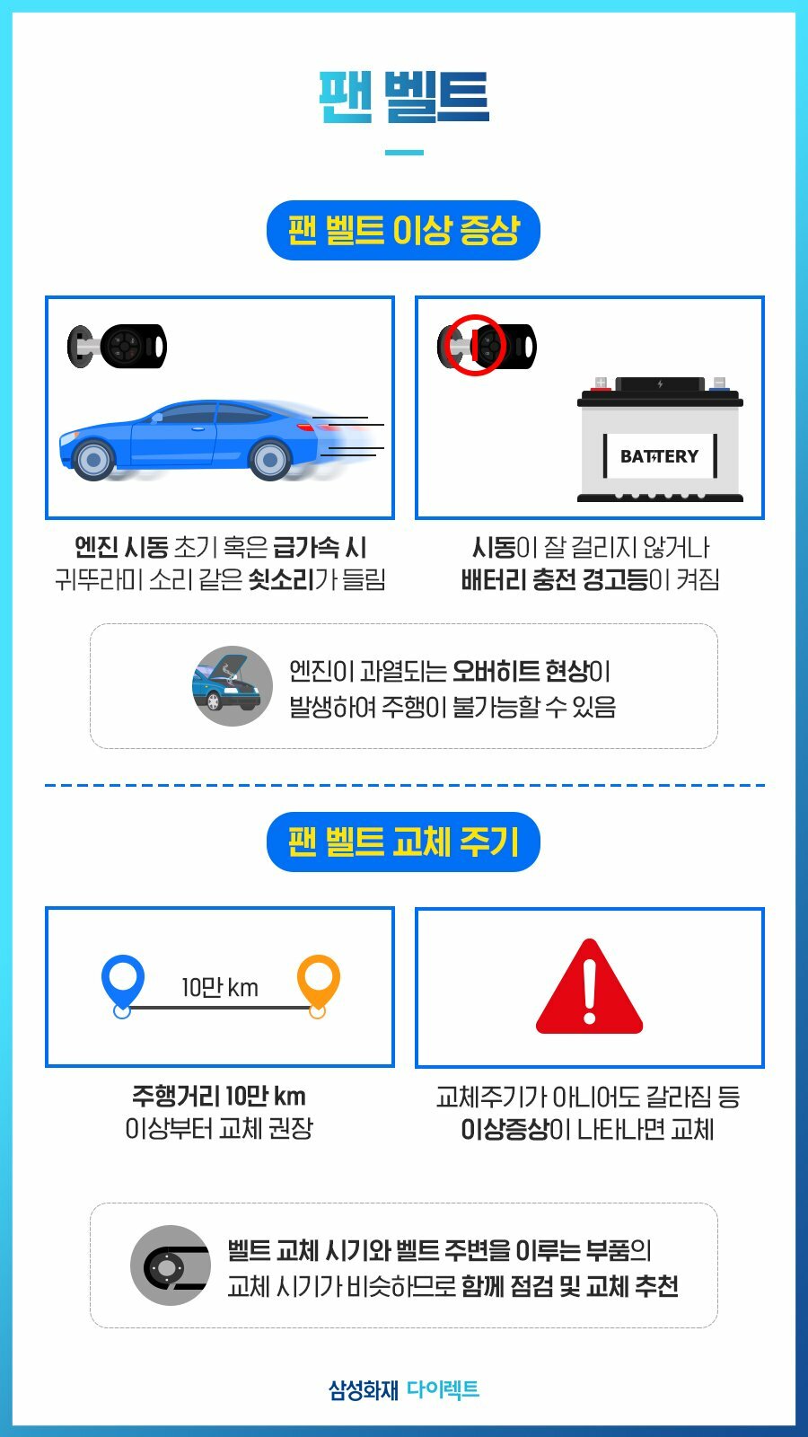 만일 팬 벨트 이상을 눈치채지 못하고 운행을 한다면 엔진이 과열되는 오버히트 현상이 나타나 주행이 불가능해지는 상황을 초례할 수 있습니다.