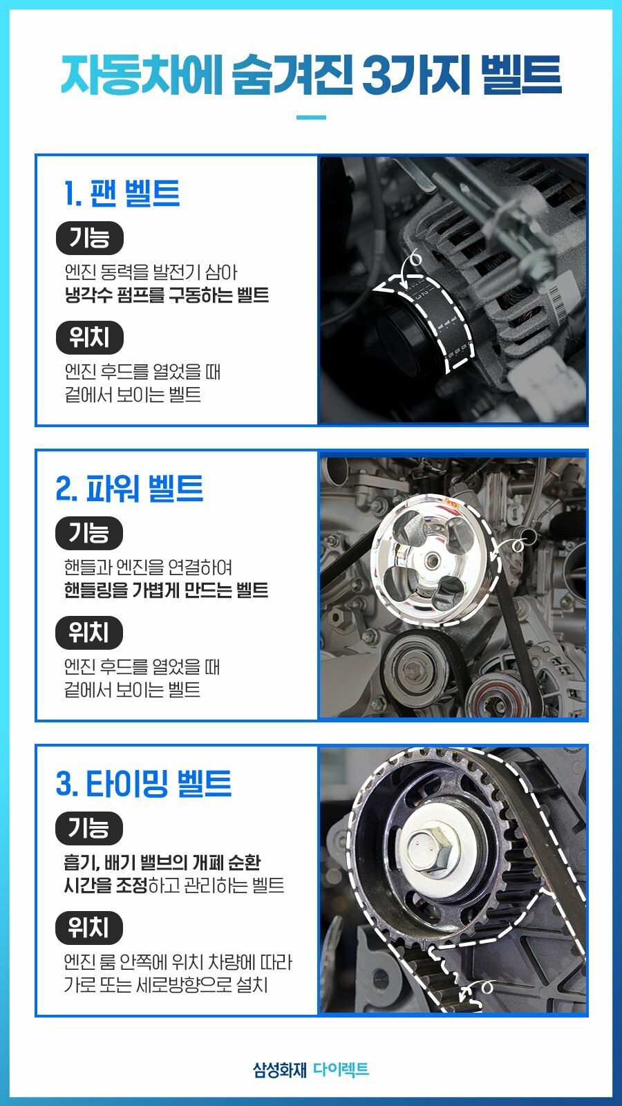 자동차에는 안전벨트 외에도 구동 벨트와 타이밍 벨트라는 부품이 존재하는데요. 구동벨트는 차종에 따라 1~3개의 벨트로 구성되어 있으며 팬 벨트, 파워벨트 등으로 구성되어 있습니다. 타이밍 벨트는 엔진의 힘을 전달해 주는 벨트를 의미합니다.