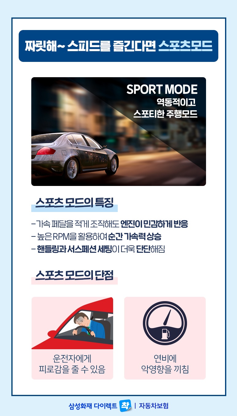 바로 스포츠모드(Sport mode)인데요, 속도감을 원하는 운전자에게 적합한 주행모드입니다. 가속 페달을 조금만 밟아도 엔진이 민감하게 반응하고 차종에 따라 핸들링과 서스펜션 세팅이 단단하게 변경되기 때문에 좀 더 역동적이고 스피드한 주행이 가능하다는 특징이 있습니다.