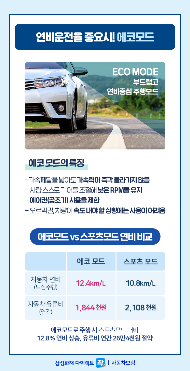 비교 결과 에코모드로 주행 시 스포츠모드 대비 12.8% 연비 상승, 유류비 연간 26만 4천 원 절약됩니다.