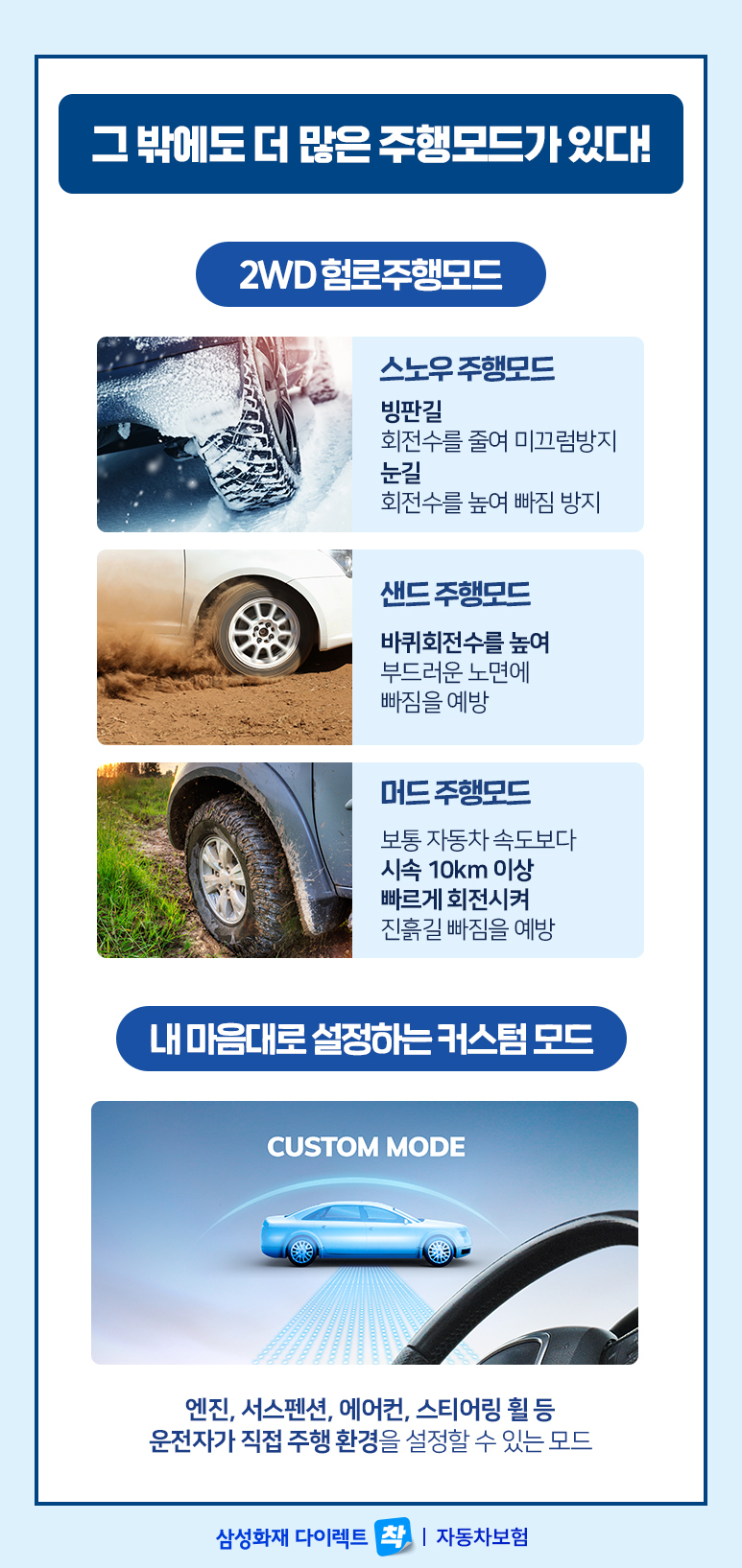 기술이 발전할수록 주행모드의 종류는 다양해져 가는데요, 대표적으로 잘 알고 있는 컴포트모드(노말모드), 스포츠모드, 에코모드 외에도 스마트모드, 2wd 험로주행모드, 커스텀모드 등이 있습니다.