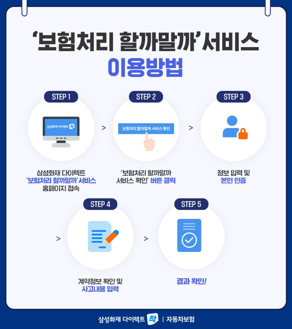 먼저 삼성화재 다이렉트 보험처리 할까말까 서비스 홈페이지에 접속합니다. 홈페이지 보상청구 탭 또는 최하단에 있는 '보험처리 할까말까 서비스' 페이지로 넘어가서 ‘보험처리 할까말까 서비스 확인' 버튼을 누르시면 됩니다.