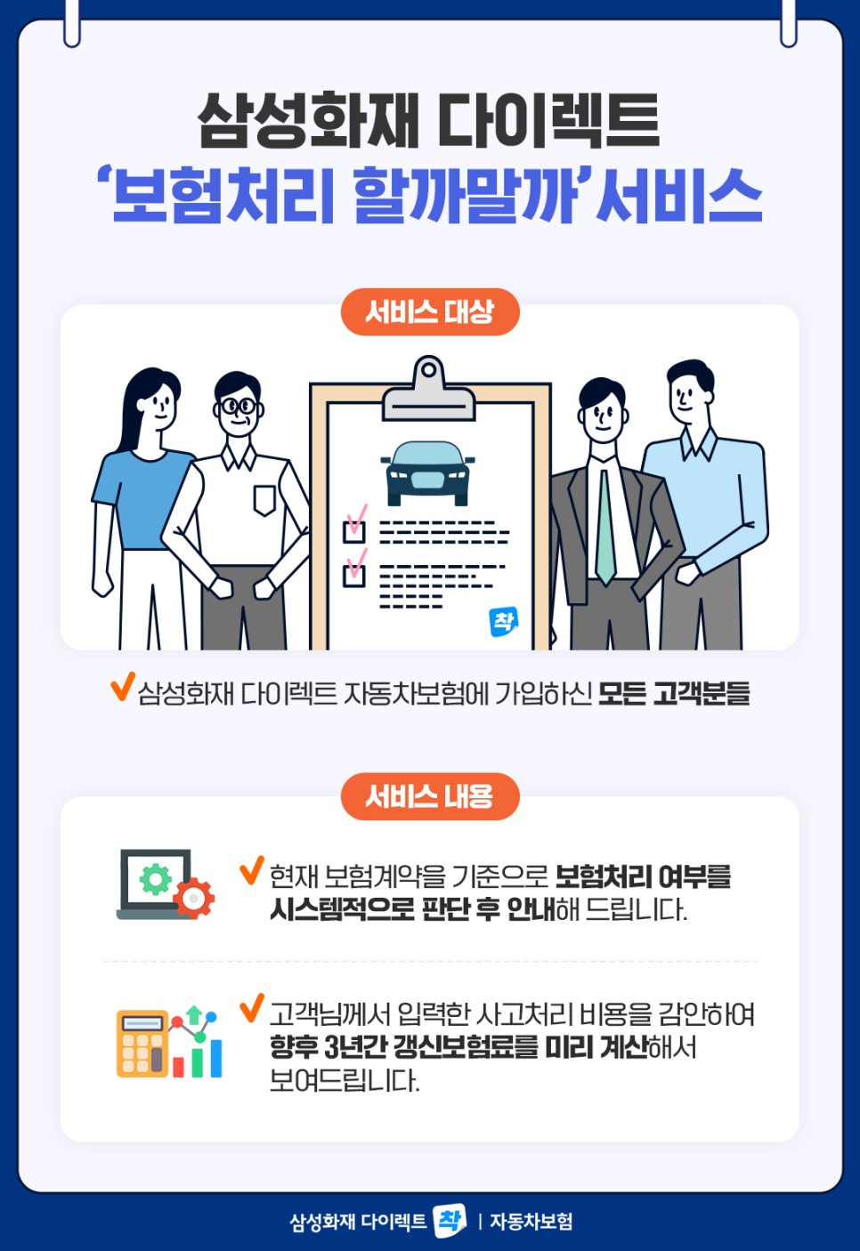 삼성화재 다이렉트의 ‘보험처리 할까말까’ 서비스는 현재의 보험 계약을 기준으로 사고를 보험으로 처리하는 것이 더 유리한지, 아니면 본인 부담으로 처리하는 것이 더 유리한지 판단 후 안내해 드리는 서비스입니다.